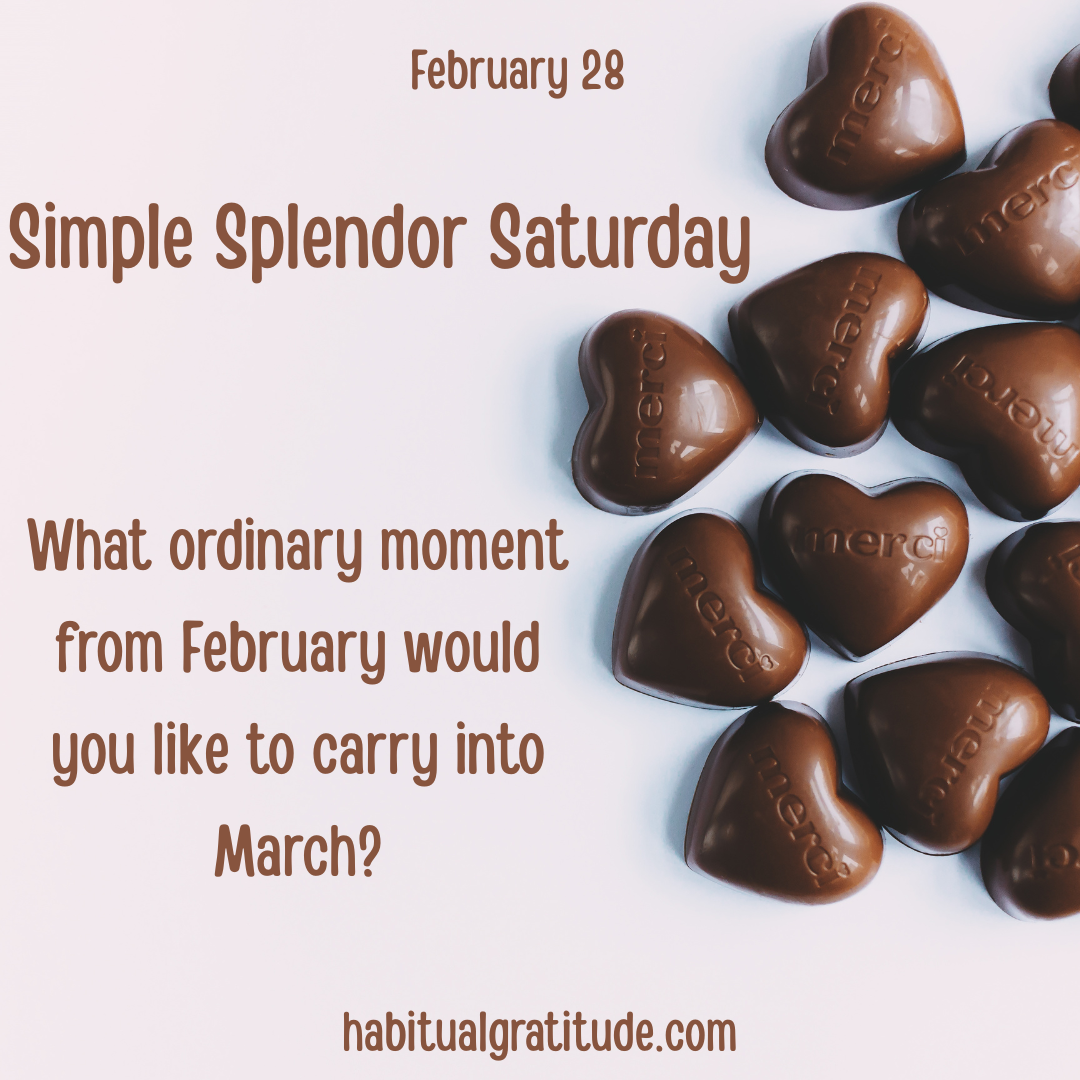 What ordinary moment from February would you like to carry into March? Feb 28 Written By Claire Sinclair Simple Splendor Saturday question of the daysimple splendor satrudayfebruary momentscarry into marchmarchlast day of the month Claire Sinclair