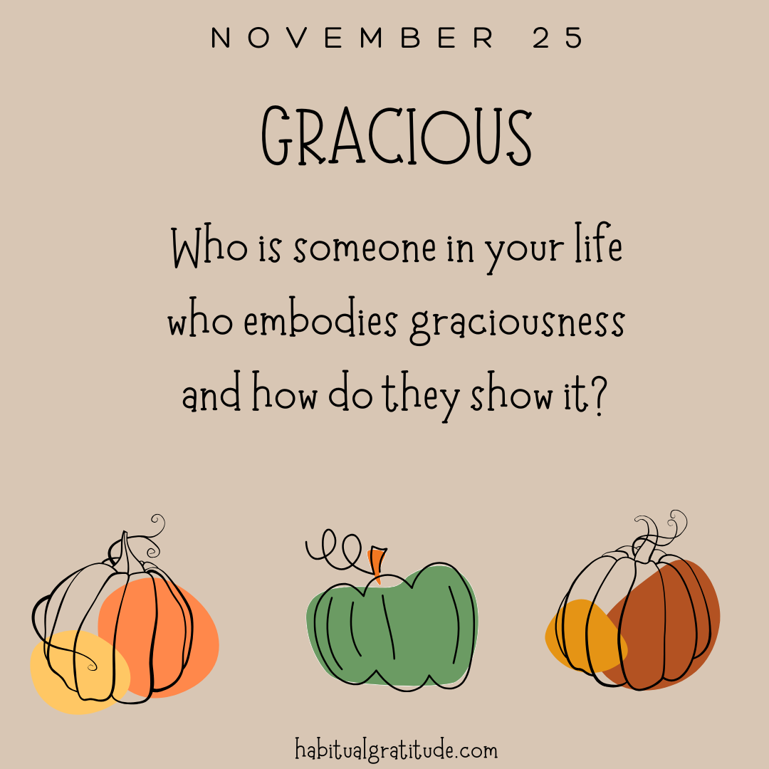 Who is someone in your life who embodies graciousness and how do they show it? Nov 25 Written By Claire Sinclair GRACIOUS word of the dayquestion of the daygracious Claire Sinclair