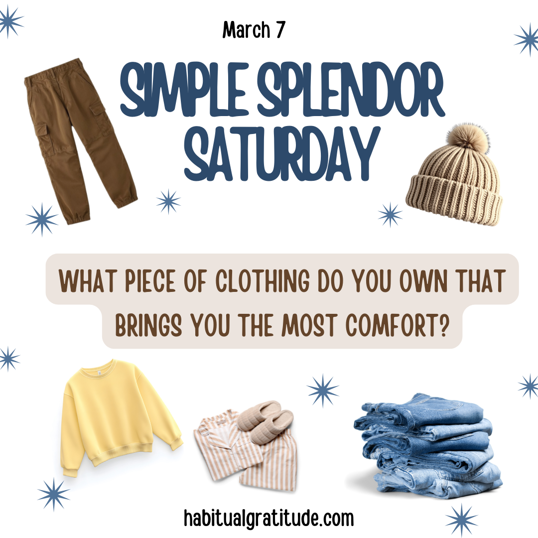 What piece of clothing do you own that brings you the most comfort? Mar 7 Written By Claire Sinclair Simple Splendor Saturday question of the daysimple splendor saturdaycomfort clothesclothingfavorite piece of clothing Claire Sinclair