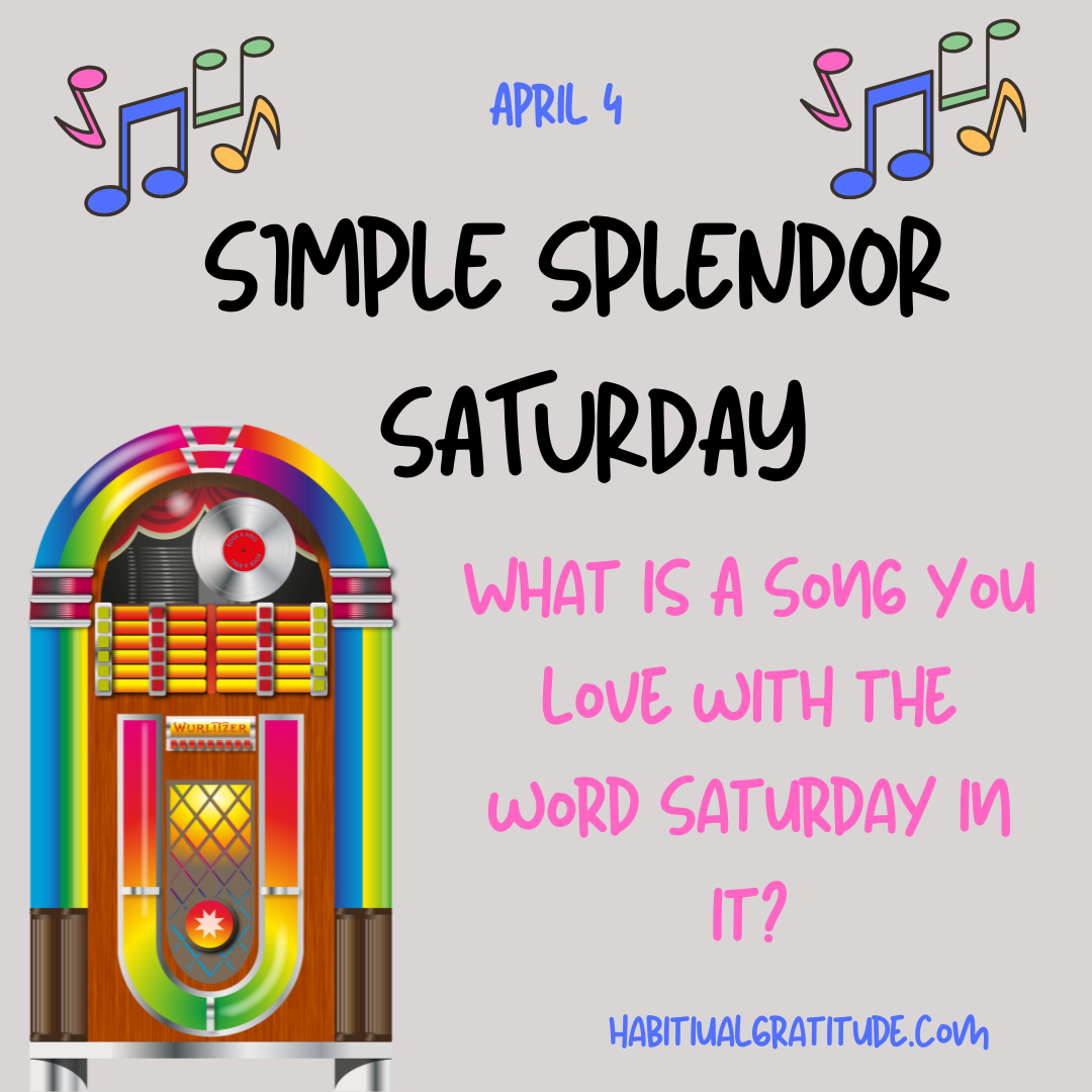 What is a song you love with the word Saturday in it? Apr 4 Written By Claire Sinclair Simple Splendor Saturday question of the daysimple splendor saturdaysongs with saturday in the titlesaturday songssaturday Claire Sinclair