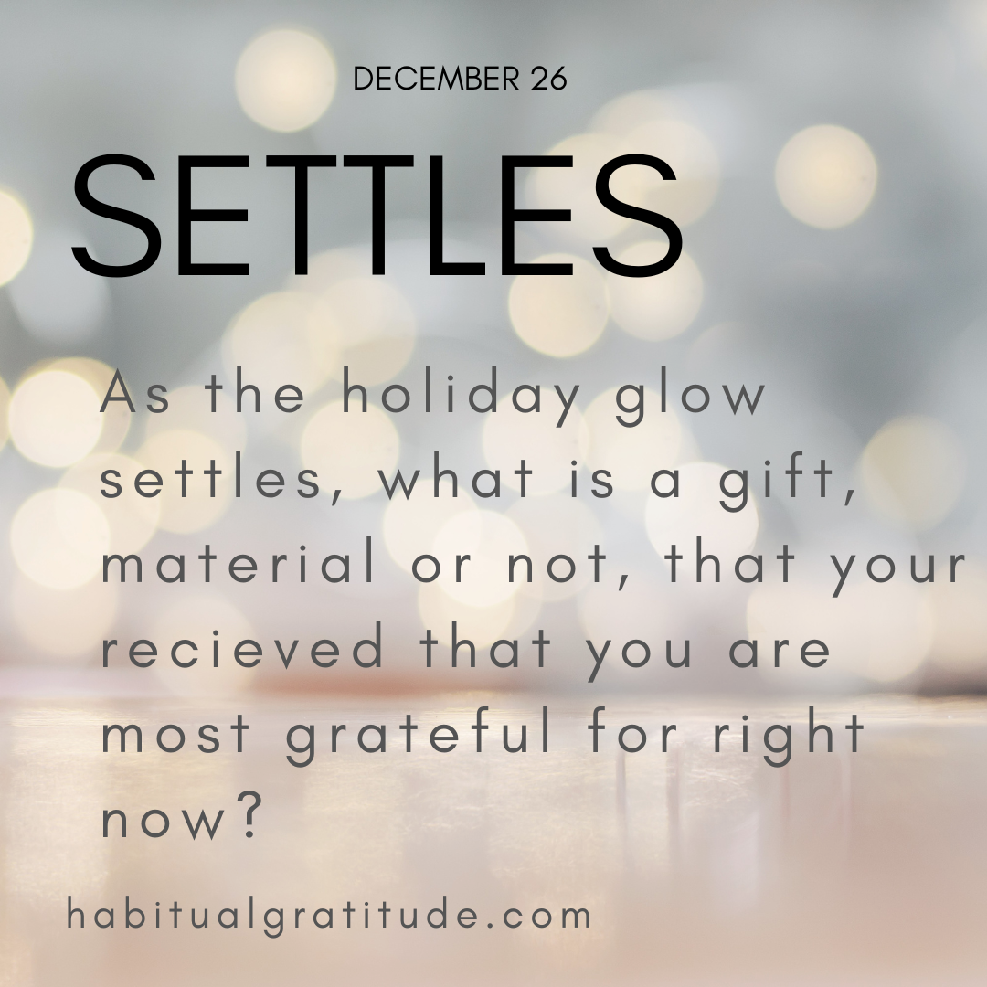 As the holiday glow settles, what is a gift, material or not, that your recieved that you are most grateful for right now? Dec 26 Written By Claire Sinclair SETTLES word of the dayquestion of the daygiftchristmas giftholidaysafter the holidayswinding down Claire Sinclair