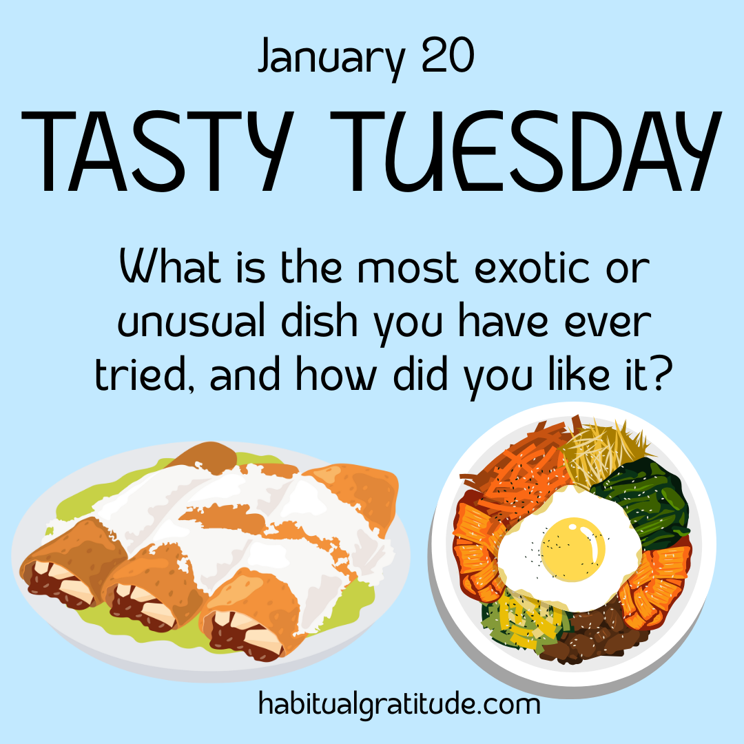 What is the most exotic or unusual dish you have ever tried and how did you like it? Jan 20 Written By Claire Sinclair Tasty Tuesday question of the daytasty tuesdayexotic foodtry it you'll like ittry something new Claire Sinclair